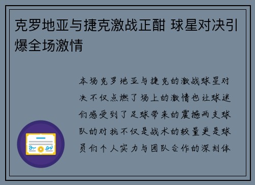 克罗地亚与捷克激战正酣 球星对决引爆全场激情