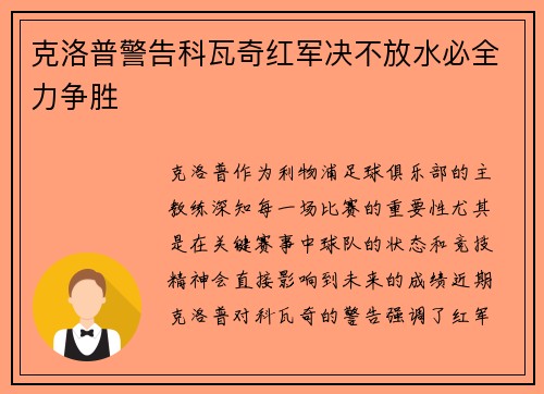 克洛普警告科瓦奇红军决不放水必全力争胜