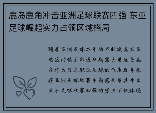 鹿岛鹿角冲击亚洲足球联赛四强 东亚足球崛起实力占领区域格局