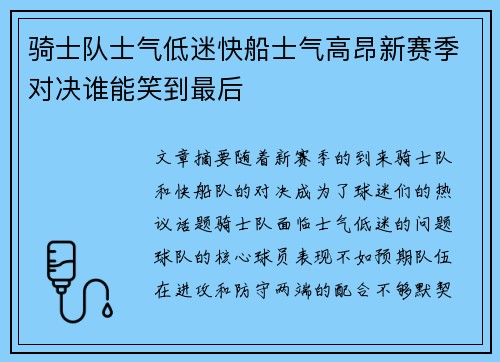 骑士队士气低迷快船士气高昂新赛季对决谁能笑到最后