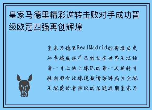 皇家马德里精彩逆转击败对手成功晋级欧冠四强再创辉煌