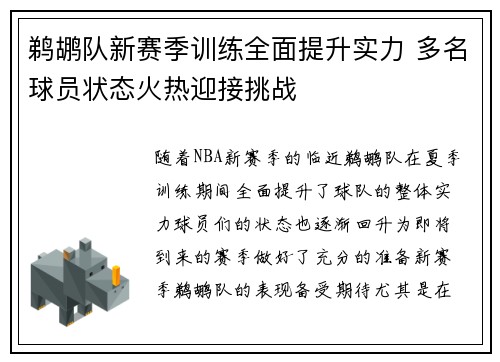 鹈鹕队新赛季训练全面提升实力 多名球员状态火热迎接挑战