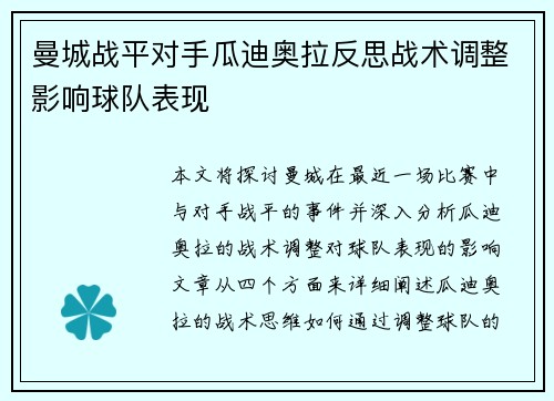 本文将探讨曼城在最近一场比赛中与对手战平的事件,并深入分析瓜迪奥拉的战术调整对球队表现的影响。文章从四个方面来详细阐述瓜迪奥拉的战术思维,如何通过调整球队的战术布局与球员角色,试图改变比赛的走势。首先,分析曼城战平对手的背景,了解比赛前的整...