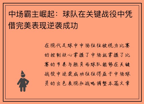 中场霸主崛起:球队在关键战役中凭借完美表现逆袭成功