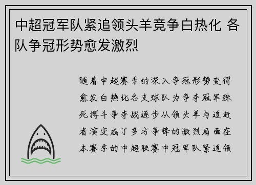随着中超赛季的深入,争冠形势变得愈发白热化,各支球队为争夺冠军殊死搏斗,争夺战逐步从“领头羊与追赶者”演变成了“多方争锋”的激烈局面。在本赛季的中超联赛中,冠军队紧追领头羊,差距不断缩小,整体竞争格局发生了显著变化。除了传统强队的表现出色之...