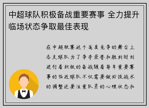 中超球队积极备战重要赛事 全力提升临场状态争取最佳表现