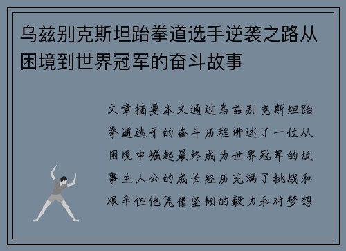 乌兹别克斯坦跆拳道选手逆袭之路从困境到世界冠军的奋斗故事