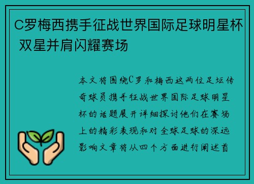 本文将围绕C罗和梅西这两位足坛传奇球员携手征战世界国际足球明星杯的话题展开,详细探讨他们在赛场上的精彩表现和对全球足球的深远影响。文章将从四个方面进行阐述:首先是C罗和梅西如何为全球球迷带来震撼的视觉体验;其次是他们的个人技术和球队合作如何...
