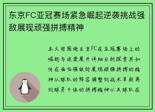 东京FC亚冠赛场紧急崛起逆袭挑战强敌展现顽强拼搏精神