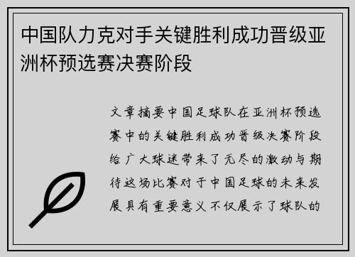 中国队力克对手关键胜利成功晋级亚洲杯预选赛决赛阶段