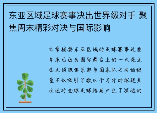 东亚区域足球赛事决出世界级对手 聚焦周末精彩对决与国际影响