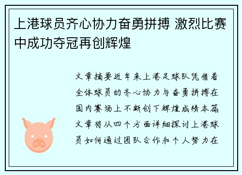 文章摘要:近年来,上港足球队凭借着全体球员的齐心协力与奋勇拼搏,在国内赛场上不断创下辉煌成绩。本篇文章将从四个方面详细探讨上港球员如何通过团队合作和个人努力,在激烈的比赛中成功夺冠,再次创造辉煌。首先,我们将从球员的团结协作谈起,分析球员们...