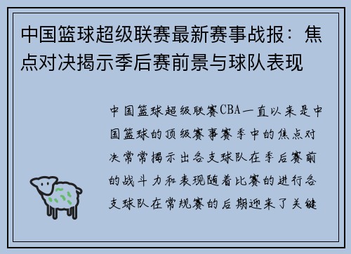 中国篮球超级联赛最新赛事战报:焦点对决揭示季后赛前景与球队表现