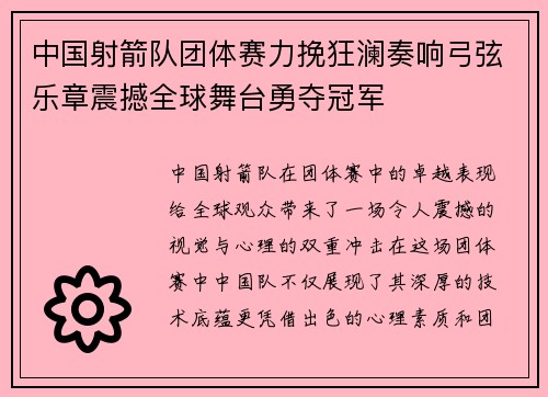 中国射箭队团体赛力挽狂澜奏响弓弦乐章震撼全球舞台勇夺冠军