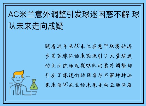 AC米兰意外调整引发球迷困惑不解 球队未来走向成疑