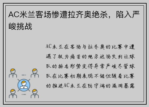 AC米兰客场惨遭拉齐奥绝杀,陷入严峻挑战