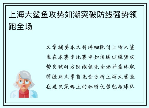 文章摘要:本文将详细探讨上海大鲨鱼在本赛季比赛中,如何通过强势攻势突破对方防线、领先全场并最终取得胜利。文章首先会分析上海大鲨鱼在进攻策略上的独特优势,包括球队整体配合、球员个人能力的发挥以及战术上的灵活性。接着,文章将从上海大鲨鱼的防守体...