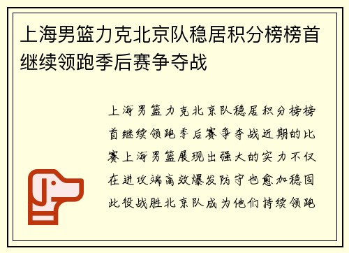 上海男篮力克北京队稳居积分榜榜首继续领跑季后赛争夺战