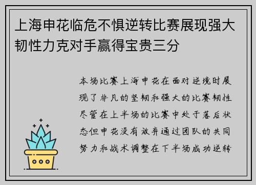 上海申花临危不惧逆转比赛展现强大韧性力克对手赢得宝贵三分