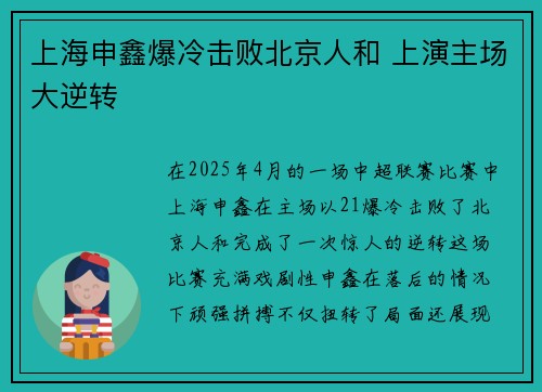 上海申鑫爆冷击败北京人和 上演主场大逆转
