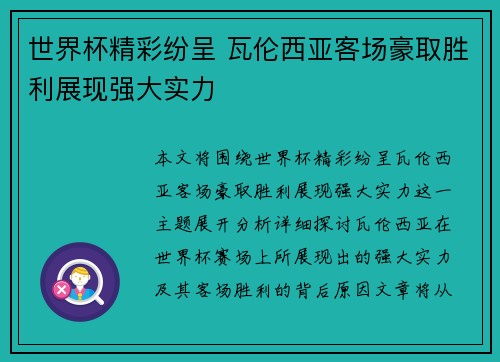 世界杯精彩纷呈 瓦伦西亚客场豪取胜利展现强大实力