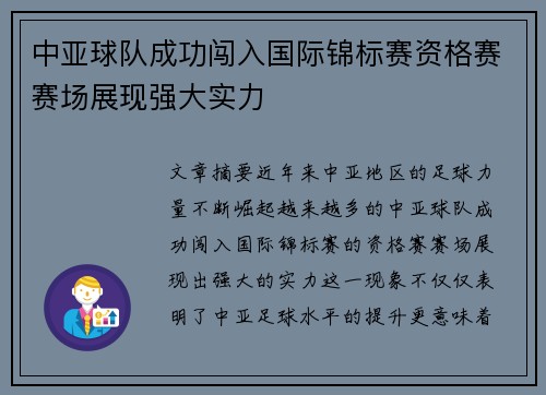 中亚球队成功闯入国际锦标赛资格赛赛场展现强大实力