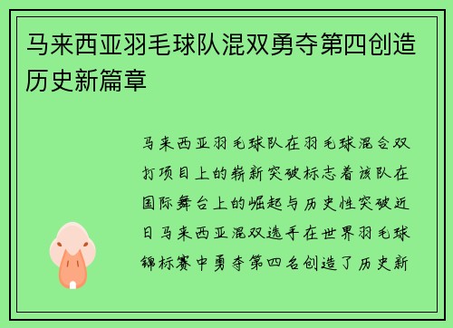 马来西亚羽毛球队混双勇夺第四创造历史新篇章
