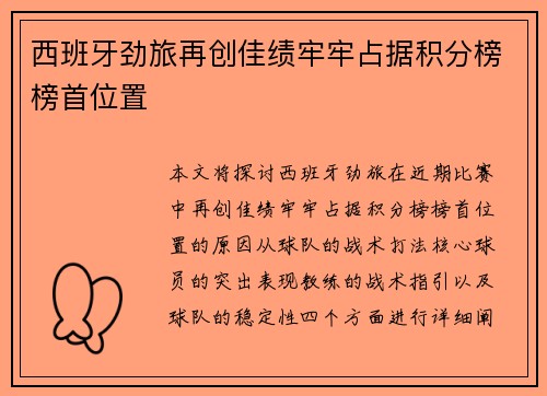 西班牙劲旅再创佳绩牢牢占据积分榜榜首位置