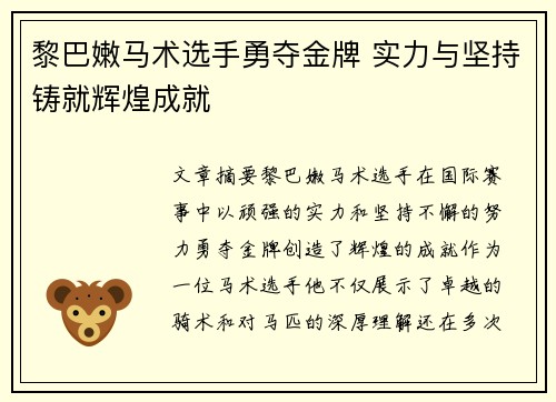 文章摘要:黎巴嫩马术选手在国际赛事中以顽强的实力和坚持不懈的努力,勇夺金牌,创造了辉煌的成就。作为一位马术选手,他不仅展示了卓越的骑术和对马匹的深厚理解,还在多次比赛中屡屡突破自己,赢得了世界的认可。这篇文章将从四个方面详细阐述黎巴嫩马术选...