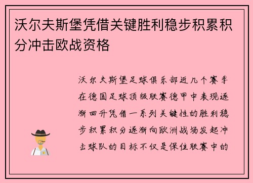 沃尔夫斯堡凭借关键胜利稳步积累积分冲击欧战资格