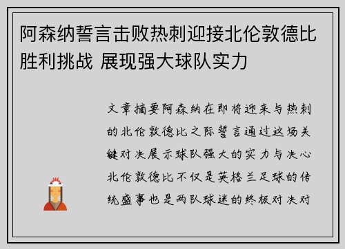 文章摘要:阿森纳在即将迎来与热刺的北伦敦德比之际,誓言通过这场关键对决展示球队强大的实力与决心。北伦敦德比不仅是英格兰足球的传统盛事,也是两队球迷的终极对决。对于阿森纳来说,击败热刺并赢得这场比赛,不仅是为了荣誉和积分,更是展现球队深厚底蕴...