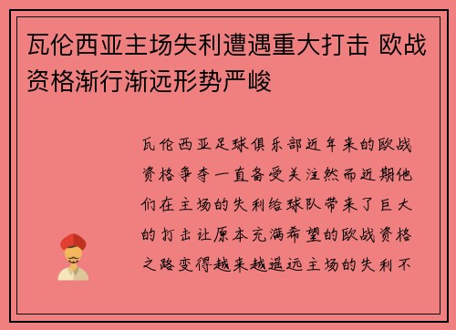 瓦伦西亚主场失利遭遇重大打击 欧战资格渐行渐远形势严峻