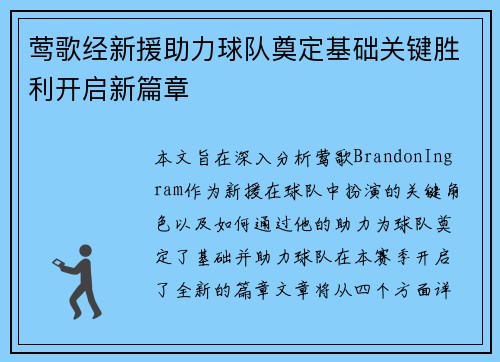本文旨在深入分析莺歌(Brandon Ingram)作为新援在球队中扮演的关键角色,以及如何通过他的助力,为球队奠定了基础,并助力球队在本赛季开启了全新的篇章。文章将从四个方面详细探讨这一主题:一是莺歌的个人能力及其对球队战术的提升,二是莺...