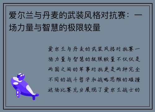 爱尔兰与丹麦的武装风格对抗赛:一场力量与智慧的极限较量,不仅仅是两国之间的军事对抗,更是两种完全不同的战斗哲学和战略思维的碰撞。这场比赛充分展现了爱尔兰战士的力量与勇猛,以及丹麦战士的智慧与策略。两国的武装风格各具特色,爱尔兰更注重体能和硬...